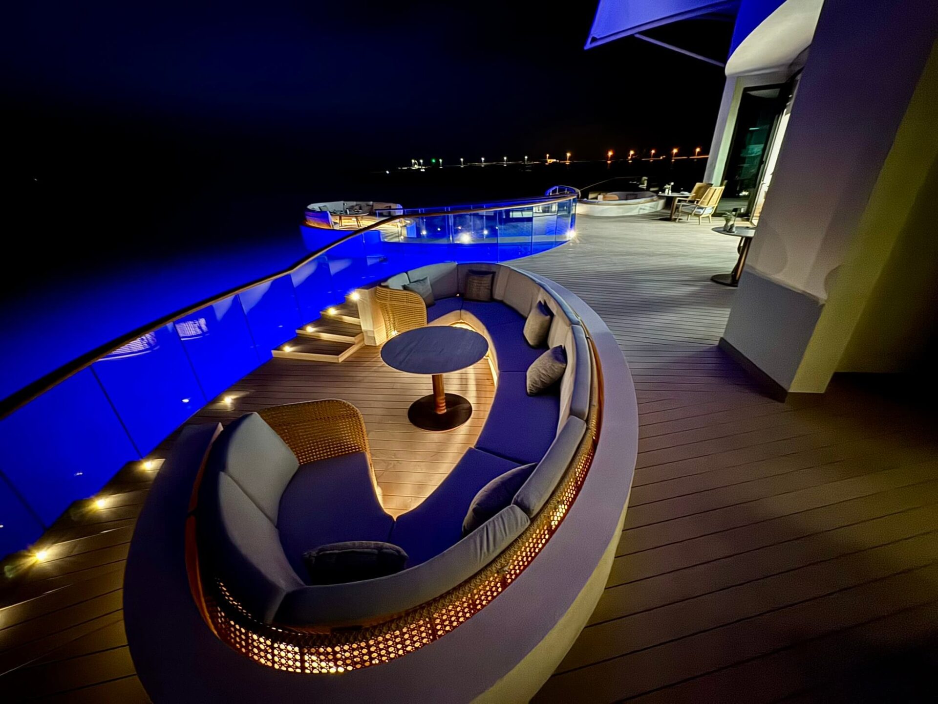 Jedinou a la carte restauraci najdete na konci „mola“ kousek od přístaviště. Velmi elegantní a designový prostor ve stylu lounge. Uvnitř klasické stoly, ale doporučuji si zarezervovat venkovní sezení na terase. Celá strana je orientovaná na západ a tudíž je skvělým místem pro romantické západy slunce. Vychutnat si večeři nebo drink můžete v pohodlných polstrovaných oválech, které jsou umístěny i samostatně nad vodou. Po setmění se pak pod nimi rozzáří modrá světla, která vytvoří magickou atmosféru.